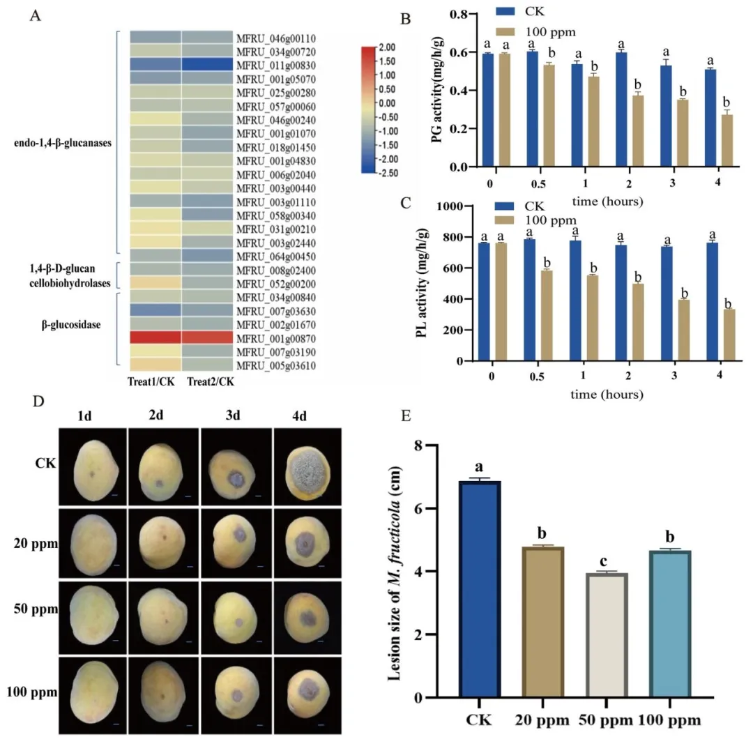 Fig. 5:DETS 对桃褐腐病的抑制效果。A. DETS 处理下褐腐病菌初始侵染相关基因的热图;B. DETS 处理下褐腐病菌致病酶多聚半乳糖醛酸酶(PG)的活性;C. DETS 处理下褐腐病菌致病酶果胶裂解酶(PL)的活性;D. 不同浓度 DETS 对褐腐病发展的抑制效果;E. 不同浓度 DETS 处理后桃褐腐病的病斑大小
