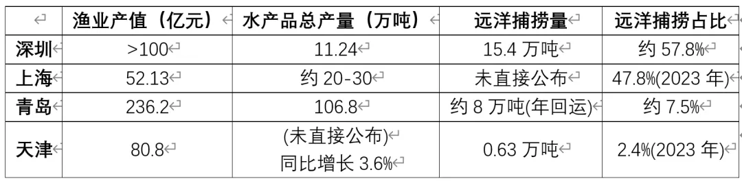 数据说明:深圳数据来自深圳市统计公报,水产品总产量11.24万吨为本地生产(含海水、淡水养殖及近海捕捞)。远洋捕捞量15.4万吨为深圳企业赴公海捕捞并运回的量。远洋捕捞占比按15.4/(11.24+15.4)≈57.8%计。青岛远洋捕捞占比按回运量8万吨占本地总产量106.8万吨计算,约为7.5%。上海、天津2024年远洋捕捞具体占比为2023年数据。