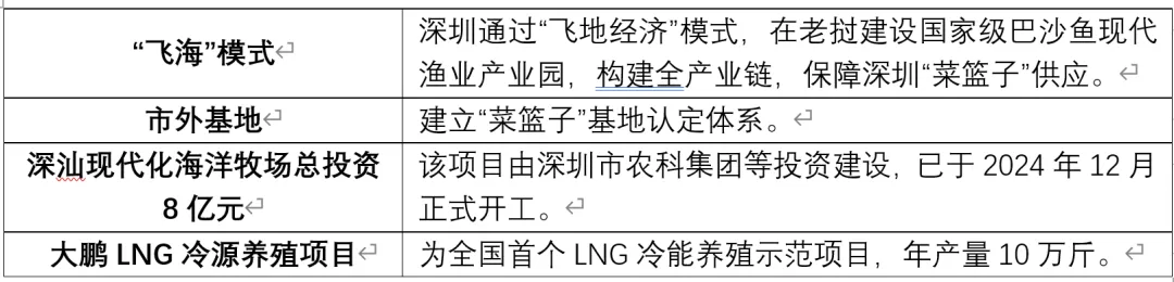 面对土地和海域资源紧张的现实,深圳创新推出飞海模式,在市外布局水产养殖菜篮子基地,聚焦高附加值的现代海洋牧场建设:总投资8亿元的深汕现代化海洋牧场园区已开工建设,大鹏LNG冷源养殖项目年产出高品质水产品约10万斤,不断创新外拓空间、内提质量的都市渔业模式,为一线城市发展渔业提供了可复制的样本。