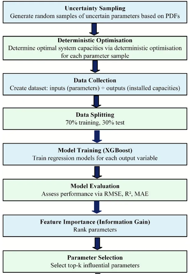 1. 机器学习技术与随机规划理论深度融合,构建兼具计算效率与工程实用性的优化框架研究团队巧妙运用XGBoost算法对高维不确定性参数进行智能筛选,仅保留对系统设计影响最大的关键变量,从而将场景生成维度从数千个压缩至200个代表性场景,大幅提升了计算效率。这种方法不仅克服了传统随机规划中"维度灾难"的难题,还首次实现了能源技术参数与市场风险因子的协同优化。