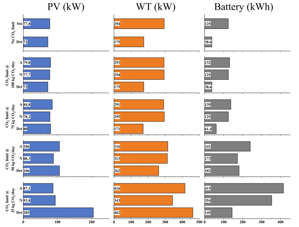 在系统配置方面,随机规划方案展现出显著优势。与确定性设计相比,随机优化推荐的系统配置增加了储能容量投资,光伏、风电和电池的优化容量分别达到88.3千瓦、313千瓦和173千瓦。这种配置策略体现了"以储促优"的设计理念,通过储能系统的灵活调节能力平抑可再生能源波动,降低对电网的依赖。在严格的二氧化碳排放约束下(50公斤/天),随机设计的平均成本比确定性设计低35%,凸显了灵活性投资的经济价值。