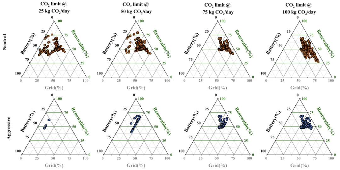 能源份额分析揭示了系统的运行智慧。如图8所示,随着碳排放约束收紧,系统运行策略明显向可再生能源倾斜。在50公斤二氧化碳/天的严格约束下,电网依赖度持续低于25%,风光发电占比显著提升。三元图清晰展示了不同场景下能源结构的自适应调整能力,随机设计在"激进"减排策略下形成更集中的运行区域,表明系统在各种不确定性条件下都能稳健满足排放目标。