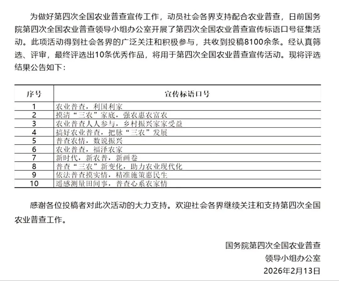 第四次全国农业普查宣传标语口号征集评选结果揭晓