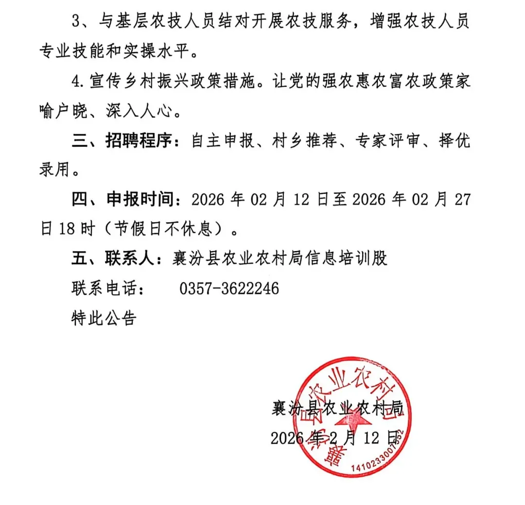 >襄汾县农业农村局公开招聘2026年基层农技推广体系改革与建设项目农业科技试验示范基地、特聘农技员实施单位和个人的公告!