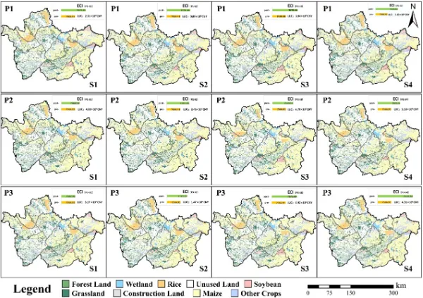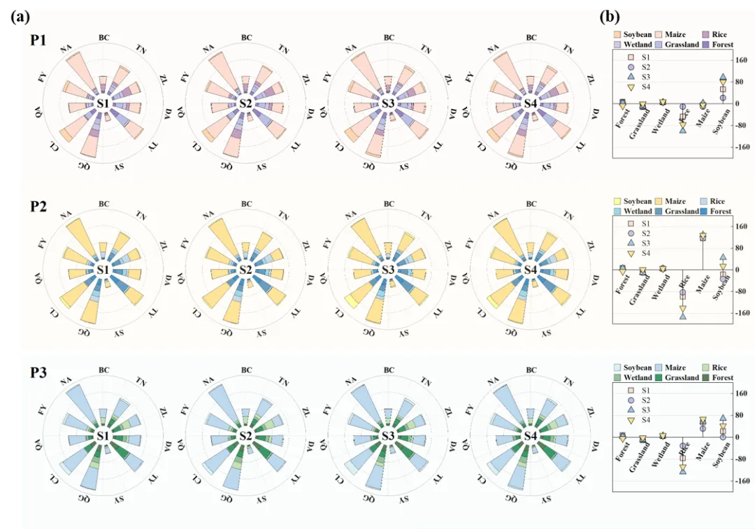 针对上述挑战,中国科学院东北地理与农业生态研究所联合吉林省水文与水资源局,以吉林西部为典型研究区,突破了传统水土资源配置中总量优化与空间格局分离的研究范式,构建了一个水–碳–粮–生态多要素协同的水土资源优化配置与空间布局一体化研究框架,实现了从宏观资源配置到微观空间落地的系统衔接。在宏观尺度上,模型以农业灌溉用水约束为核心,综合考虑经济收益、粮食生产、固碳效益与生态效益等多重目标,设置经济优先(P1)、碳汇优先(P2)和综合协调(P3)三类决策偏好,并在平水年与枯水年条件下,分别引入常规灌溉与节水灌溉情景(S1-S4),刻画不同水资源条件与管理策略下水土资源配置方案的响应差异。在微观尺度上,将宏观优化的土地利用结果作为空间约束条件,引入生态连通性(ECI)与土地利用转化成本(LUC)指标,对土地利用类型在栅格尺度上的空间布局进行优化,实现水土资源配置与空间格局调控的协同统一。