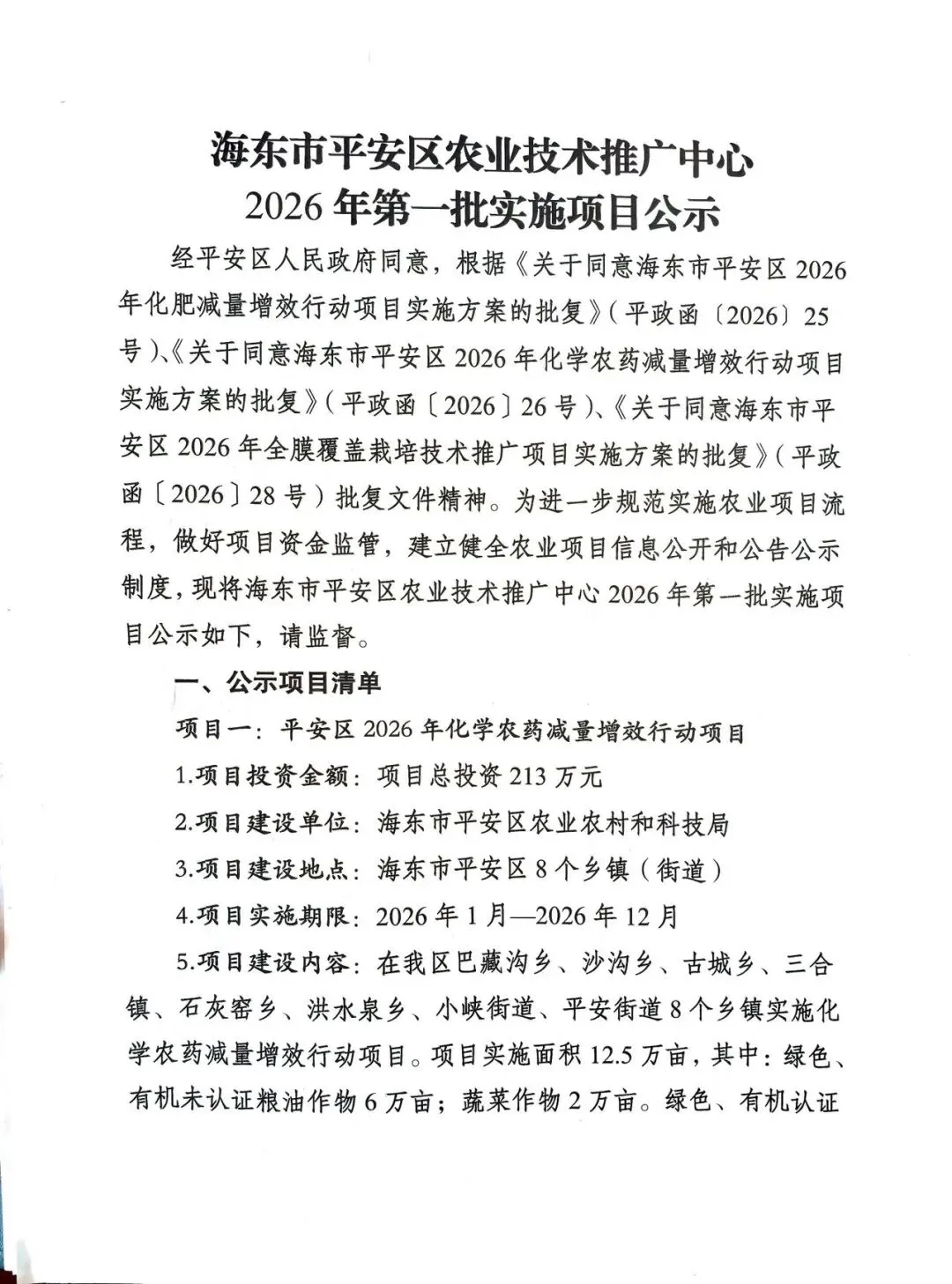 海东市平安区农业技术推广中心2026年第一批实施项目公示
