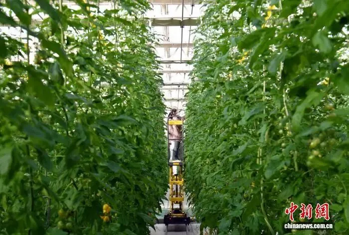 2月11日,雄安一农业园的智能玻璃温室内,游客正在采摘西红柿。