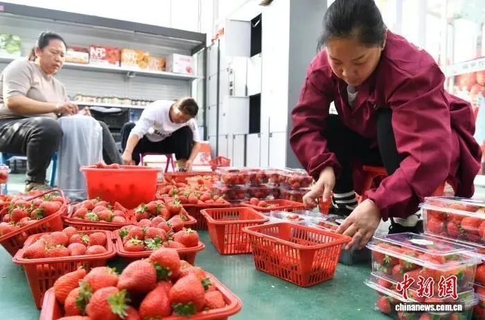 2月11日,雄安一农业园的智能玻璃温室内,工作人员正在打包采摘下来的草莓。