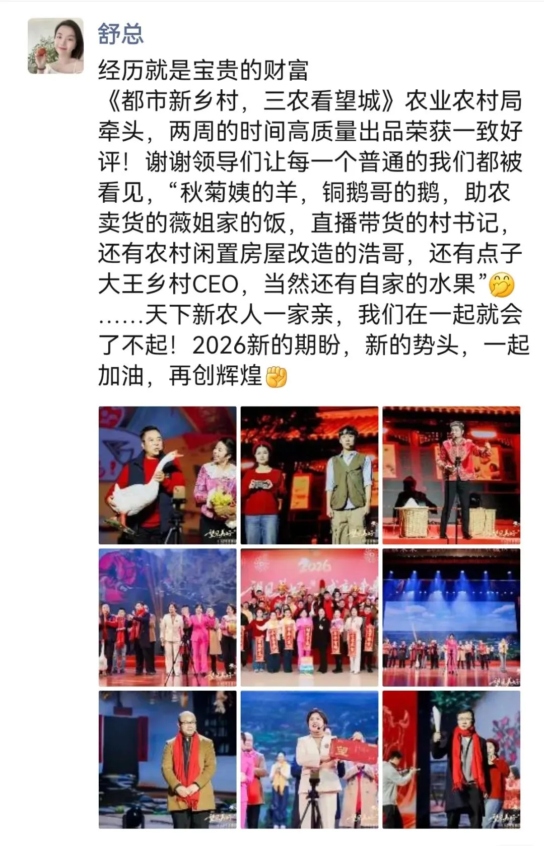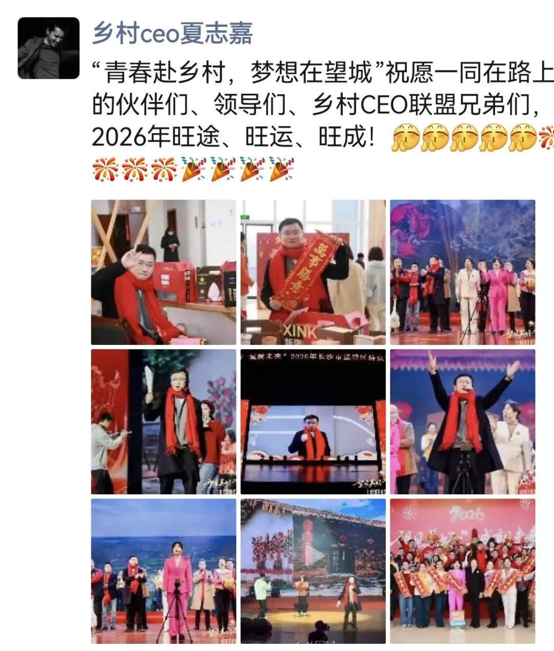 成有望:这还只是其中两位,我们这样的乡村CEO还有9位!他们都在各自的专业领域里面带动着乡亲们创收致富!夏哥,你把其他的乡村CEO都请过来吧!等会儿一起拍个全家福!!