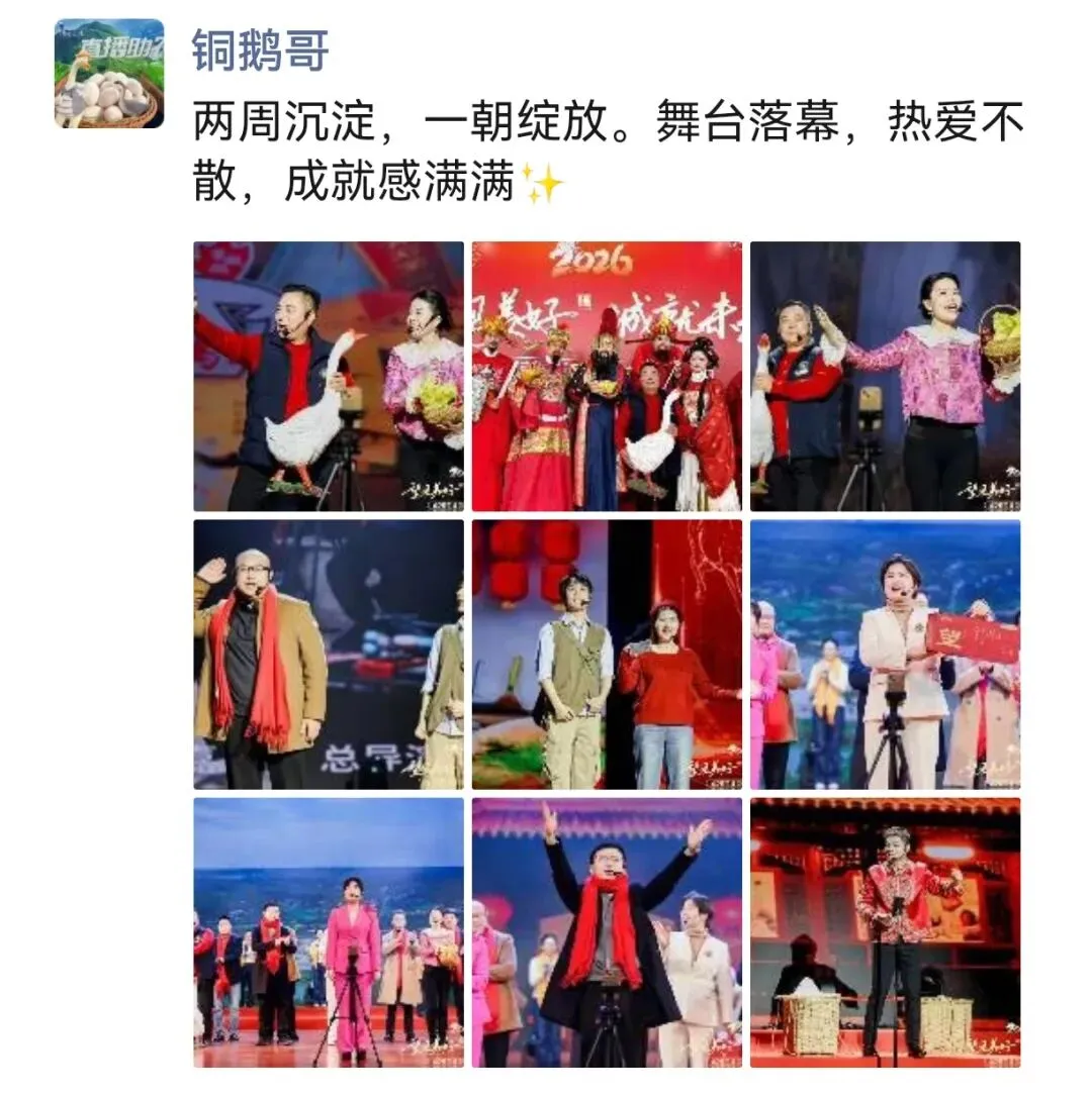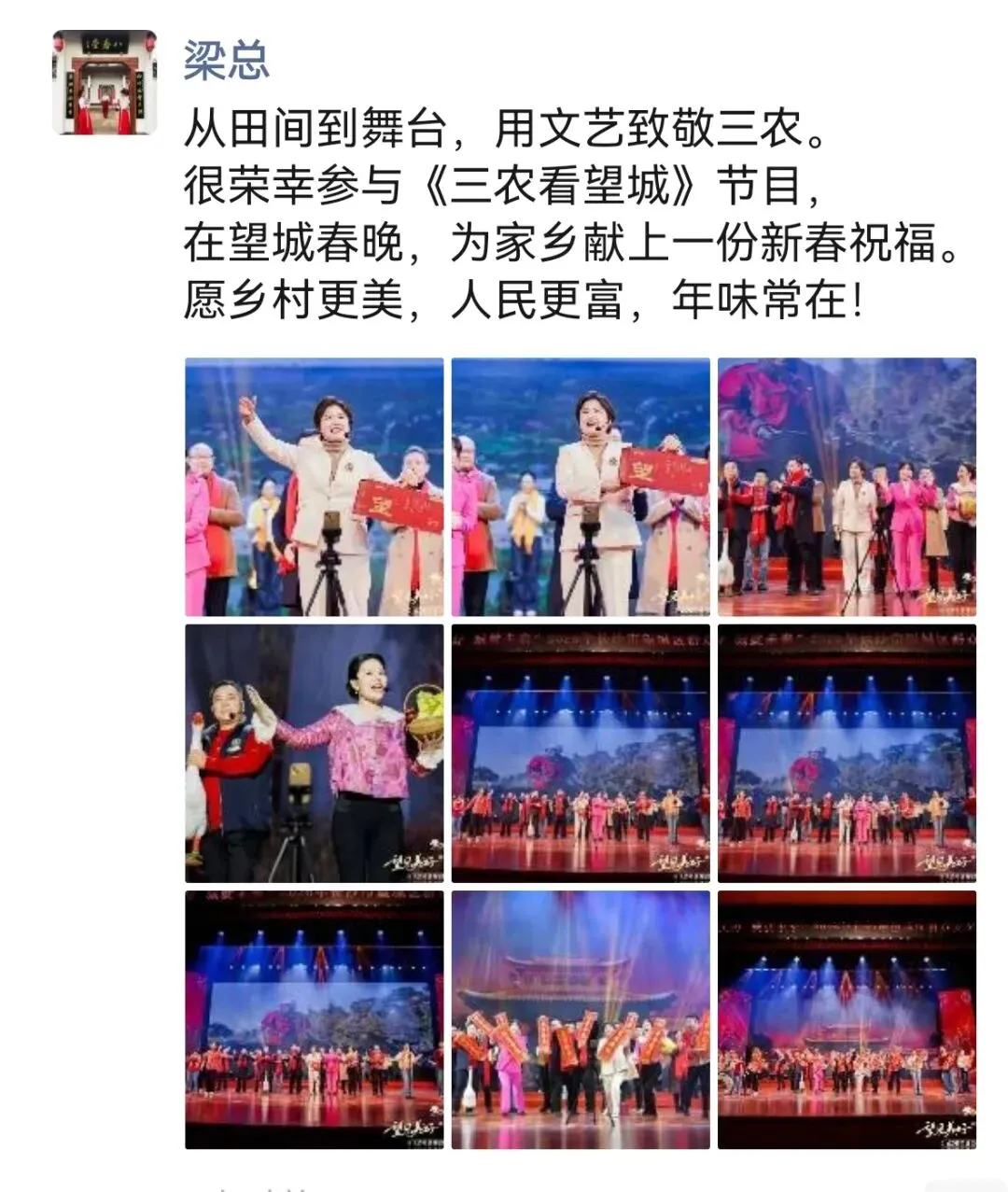 (卞书记挑着箩筐年货上台) 【补锅音乐起】卞书记:(一个踉跄)哎哎哎……村支书记不容易啊,又直播来又唱戏!乡亲们喊我卞书记,粉丝们却叫我小卡书记。家人们,欢迎来到小卡书记的直播间!雷锋家乡有好人,更有好的农产品!今天来到小卡书记的直播间,来对了!有福了!今天推荐个不一样的爆款:“乡村年味一日游”,让我们一起来乡里过大年,好不好!上午摘蔬菜、采蘑菇;中午吃铜鹅、小龙虾;下午写春联、做福字;晚上住民宿,小卡书记陪你数星星哦!今天只要惊爆价198 !心动就要行动,3.2.1!上链接!成有望:(对这小天的镜头)链接已上,刷新去拍!给大家介绍下,我身边的就是咱村支书——卞书记。我们望城的村书记啊,为了帮村里把农特产卖得更好,定期开展直播,直播销售额已经累计突破100万元了!【音乐停】小天:(边拍边说)不可思议啊!望城的乡村书记真是卧虎藏龙,个个都下不得地!!(成有望、小天走向另外一处)成有望:我和你说啊!接下来这几位可不得了哦!那都是我们望城乡村的大网红哦!(小天连忙举起设备,对准正在直播的吴微)【好运来音乐起】微姐:(激情澎湃)家人们,我是在望城做餐饮的微姐!专收乡里菜,回城里恰。我帮脱贫户卖过鸡,卖过蛋,也卖过我屋里喷香的糯米饭!年脚边了,再莫讲哒,赶紧来望城恰年夜饭!独一要来喔~周总:鹅鹅鹅,曲项向天歌,我是桥驿铜鹅哥,如今学会了开直播,销量飙升节节高,要吃鹅,就找我!欢迎大家来望城呷鹅啰!(微姐和周总继续与自己直播间里的粉丝互动)【音乐停】小天:哇!有望哥,互联网整活儿这块咱们玩的是贼溜呀!成有望:那必须啊!现在光咱农民兄弟自己的自媒体账号,就有200多个啦,你看今天他们也来这里开直播啦!【好日子音乐起】 ,【20位农民自媒体博主+2个企业老总从两边上台,呈八字形布局站位;11位乡村CEO同步上台,站在中间靠后】秋菊:(激动)我是养羊的秋菊姨,驻村工作队本扎实,拍视频、搞宣传,帮我把羊哈卖噶哒呢!邻里乡亲哈来帮忙,答谢宴上那个个是喜气洋洋!谢谢队员们啦!(众人喝彩)成有望:啊哟!舒总,梁总你们也来啦!你们可是咱们望城的“乡村振兴合伙人”啊!舒总(舒记果园):宝子们,我在北纬28度水果大世界等你!橙子桃子和枇杷,玲琅满目眼挑花!千亩荒山变金山,189种珍稀水果请您尝!全省首创、长沙第一,你们说牛不牛?(众人喝:牛!)宝子们,不是海南去不起,而是望城更有信价比!快来快来,我们一起逃离城市,水果自由!梁总(望城有礼):周总的铜鹅,文和友的虾,采盟的蘑菇,舒记的瓜,开天的瘦鱼、乌山的茶!好物都在“望城有礼”!我们通过线上推广,线下展销,今年销售额已经实现了翻番!(众人喝彩) (11 位乡村 CEO 走到镜头前,夏志嘉居中说话)夏志嘉:今天当着这么多直播间的镜头,我也想说一句!谁说只有大城市大企业才能拥有 CEO?乡村 CEO 的快乐,你们想象不到!(语气模仿郭麒麟,众人笑)来,兄弟们一起和大家打个招呼!123…… (11 个乡村 CEO 齐声,对着直播镜头高喊):青春赴乡村,梦想在望城!快来当乡村 CEO 咯!! (众人齐声叫好)【音乐渐弱至停】成有望:(走上前对着直播镜头,语气感动)家人们!从以前的闲置农房到现在的 “生金资产”,从以前的愁销路到现在的爆订单,望城乡村的变化有目共睹!小天:我的毕业新闻作品太有价值了!数字赋能创奇迹,农业产业更兴旺!我宣布,我的毕业新闻作品的名字就叫做《都市新乡村,三农看望城》,我以后就是望城新农人啦!(众人喝彩,成有望和小天击掌后环顾四周众人后说话)【恭喜发财音乐】成有望:乡亲们,马上就是马年春节了!我提议,咱们给关注望城乡村发展的、线上线下的家人们一起拜个年吧!(全体演员齐喊,声音洪亮,情绪拉满):好!小天:(急切)我先来我先来!真金白银、真心实意、真抓实干,望城“三农”创辉煌!成小望:望城全体农人们,祝望城人民……全体合:“马”到成功!“马”上发财!过~年~好!……(全体演员持续挥手,灯光渐暗,音乐减弱,演员谢幕撤场)