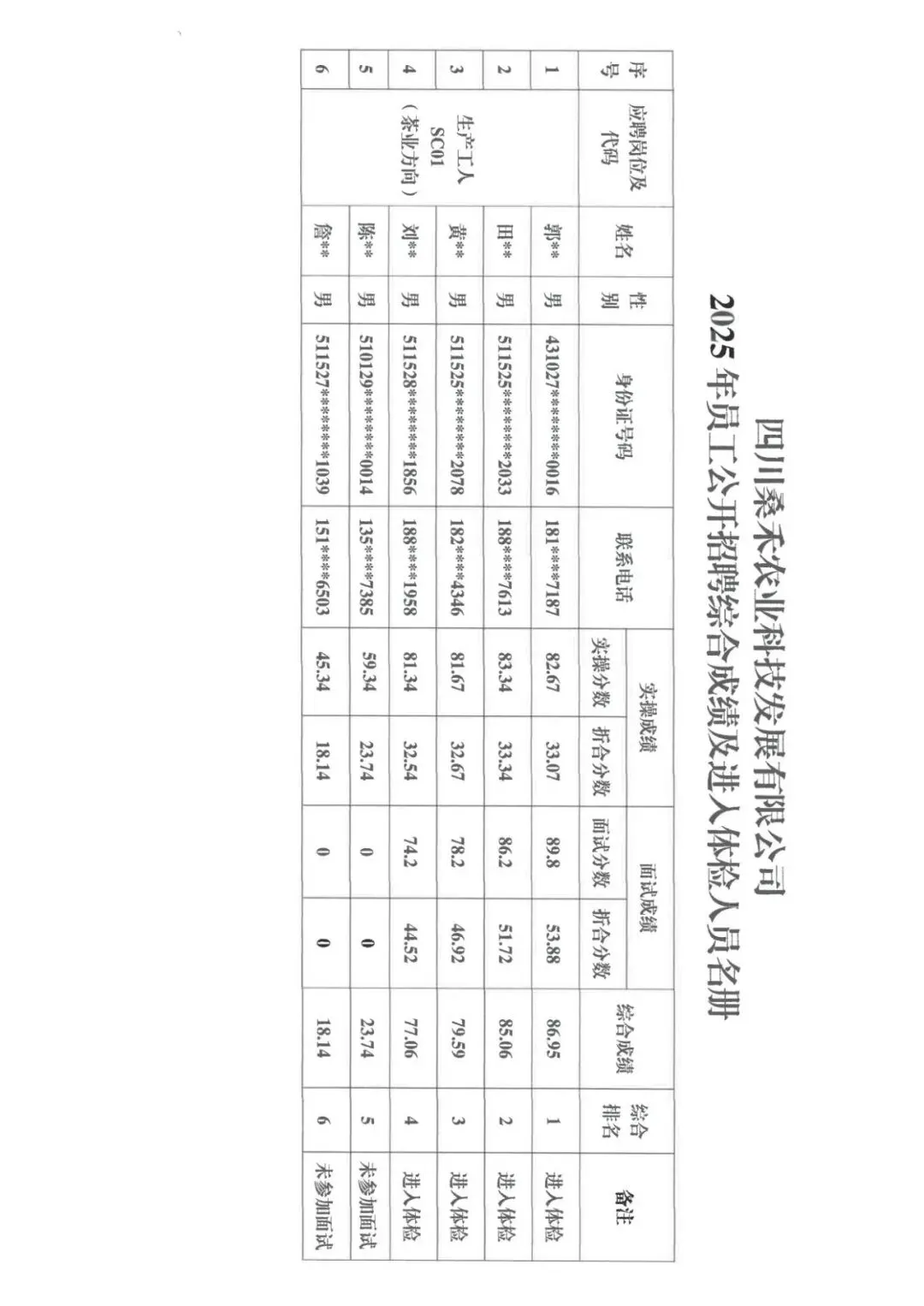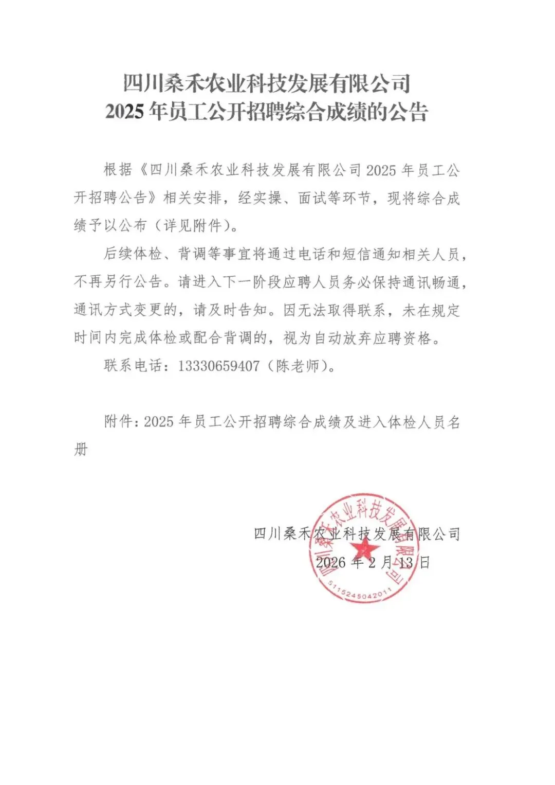 >四川桑禾农业科技发展有限公司2025年员工公开招聘综合成绩的公告