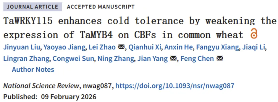 近日,河南农业大学陈锋教授课题组/宁波大学植物病毒研究所羊健研究员团队在《National Science Review》(IF=17.1)上发表了题为“TaWRKY115 enhances cold tolerance by weakening the expression of TaMYB4 on CBFs in common wheat”的研究论文。该研究成功克隆了正调控小麦低温抗性的关键基因TaWRKY115,对其基因功能进行验证,并对其作用机制进行解析。该成果不仅为阐明小麦响应低温的分子机制提供新的见解,而且为小麦抗逆育种提供了宝贵的基因资源。