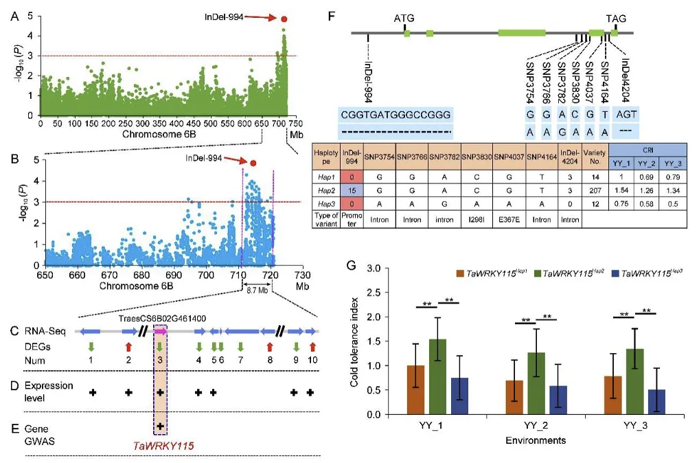 研究通过对233个黄淮麦区小麦品系进行田间冻害表型鉴定,利用全基因组关联分析(GWAS)在6B染色体上712.2-720.9 Mb区间内鉴定到一个与小麦耐冷性相关的重要基因位点。之后结合冷胁迫前后的RNA-seq分析、gene-based GWAS及单倍型分析,最终锁定TraesCS6B02G461400(注释为WRKY 转录因子样蛋白)为目标候选基因,并将其命名为TaWRKY115(图1)。