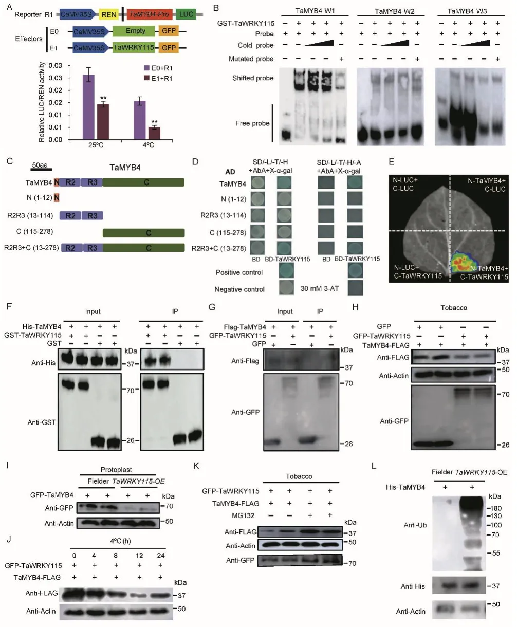通过DAP-seq和RNA-seq联合分析,研究鉴定到TaWRKY115可能的下游靶基因TaMYB4,进一步通过Dual-LUC、EMSA等实验发现TaWRKY115能够结合TaMYB4启动子区的W-box基序并抑制其表达。互作蛋白筛选发现TaWRKY115与TaMYB4在体内和体外均存在强烈互作,且TaWRKY115能够抑制TaMYB4的蛋白表达。综上,TaWRKY115在转录水平和蛋白水平均抑制TaMYB4的表达(图3)。