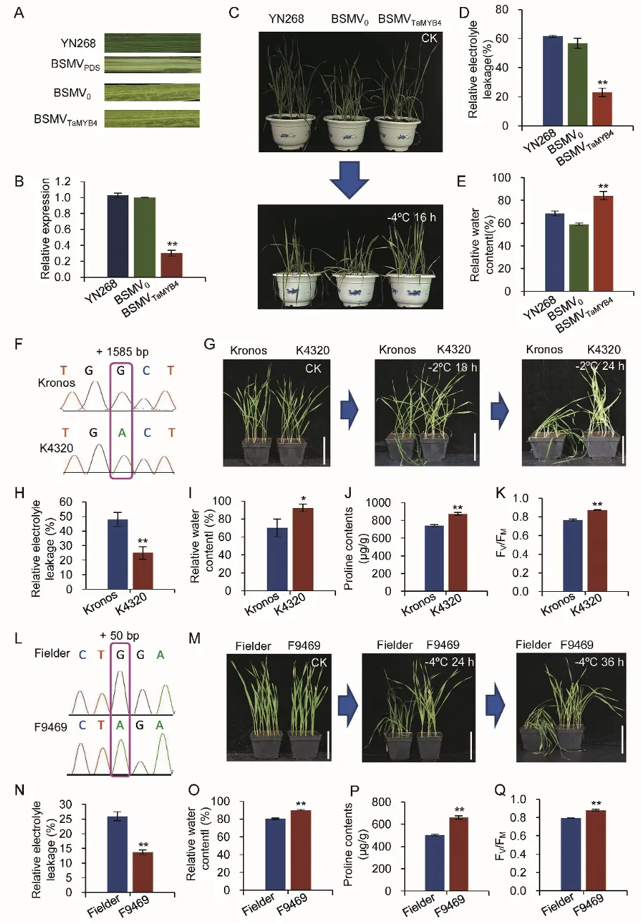 为验证TaMYB4基因功能,研究利用BSMV- VIGS技术沉默TaMYB4,并筛选到TaMYB4四倍体提前终止突变体(K4320)以及六倍体提前终止突变体(F9469)。表性鉴定显示,低温胁迫后,同野生型相比,TaMYB4沉默植株、K4320和F9469突变植株均表现出更强的耐冷性,表明TaMYB4负调控小麦低温抗性(图4)。