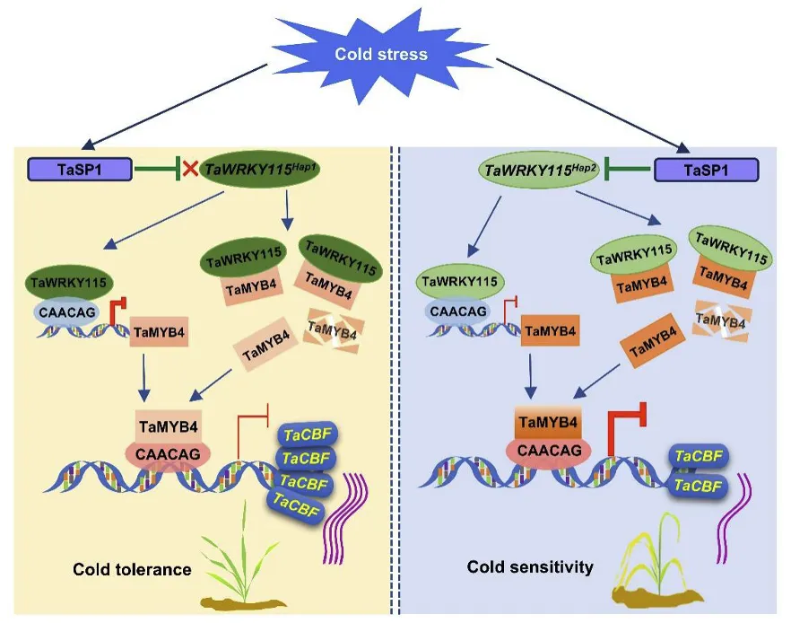 基于以上结果,研究者提出了一个工作模型:在低温胁迫下,不能被TaSP1下调的单倍型TaWRKY115Hap1作为双重抑制因子抑制TaMYB4表达,从而促使TaCBF家族正常表达,并最终表现为耐低温;相反,单倍型TaWRKY115Hap2因受到TaSP1调控下调表达,不能有效地抑制TaMYB4,因此增强了TaMYB4对TaCBF家族的抑制作用,最终导致冷敏感性(图6)。