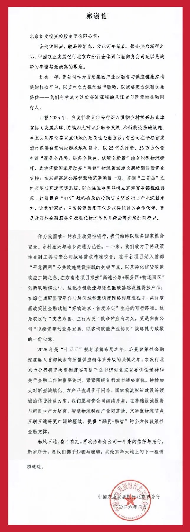 新春佳节将至,首发投资集团收到中国农业发展银行北京市分行发来的感谢信,信中对投资集团长期以来给予的信任与鼎力支持,致以诚挚的谢意。