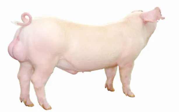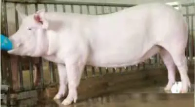 (2)加系大白猪:引进品种。被毛白色,头颈较长,面宽微凹,耳向前直立;体型高大,体躯长,背腰平直,腹线平,胸宽深,后躯宽长丰满,四肢粗壮结实;有效乳头7对以上;具有发情明显,产仔多、生长速度快、饲料利用率高、胴体瘦肉率高、适应性强的特点。适宜作杂交母本推广。