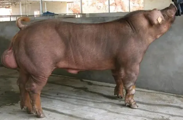 (4)加系杜洛克猪:引进品种。全身被毛棕红色,结构匀称紧凑,体躯深广,肌肉发达,背腰略呈拱形,腹线平直,四肢强健;胴体瘦肉率高,肉质较好,适应性较强,生长速度快,饲料利用率高。适宜作终端杂交父本推广。