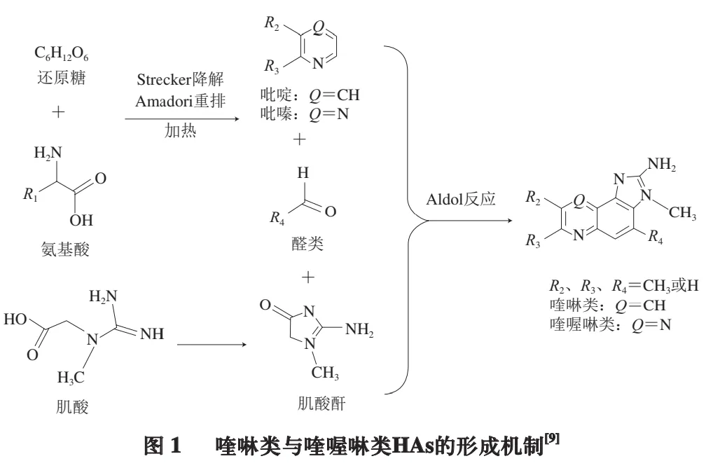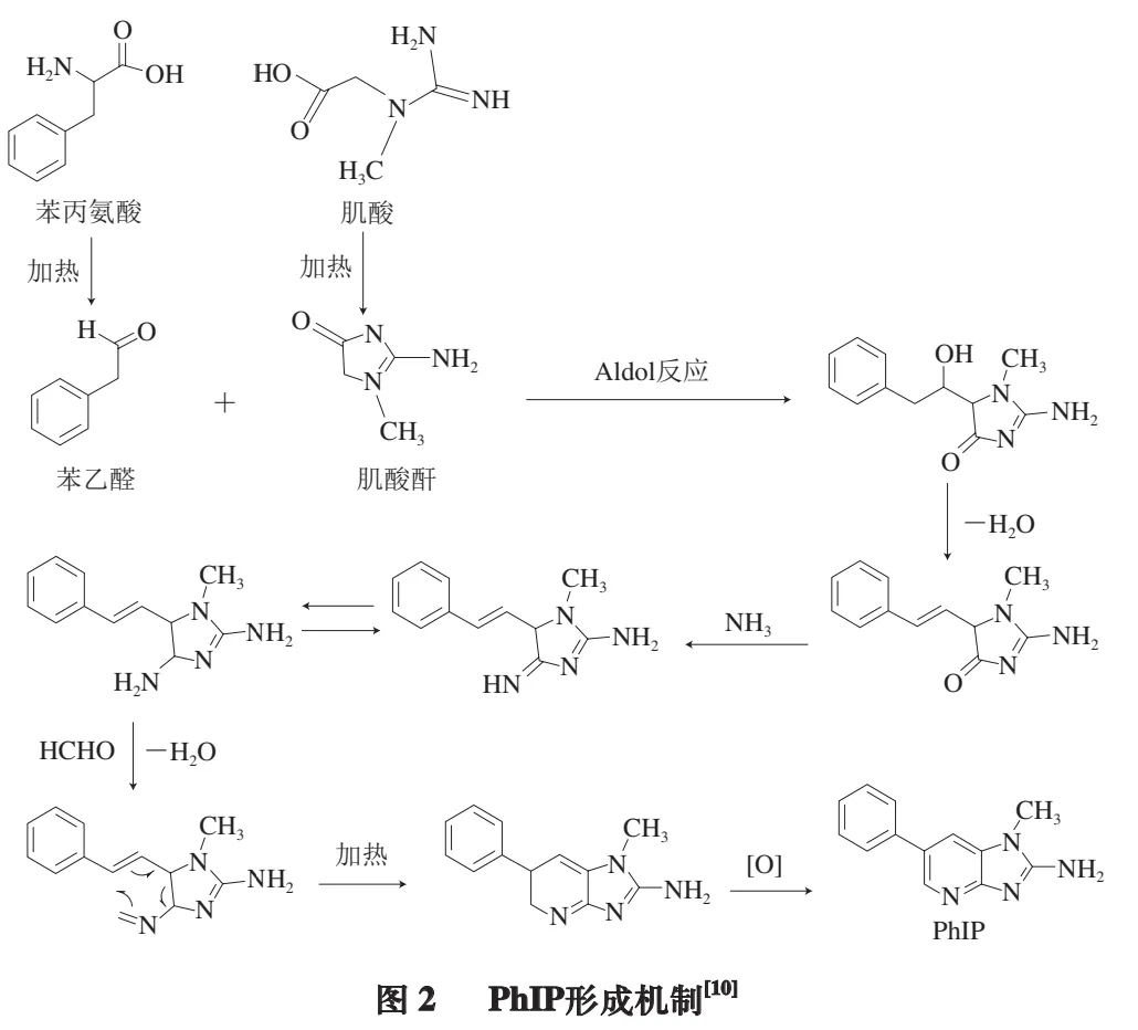 AIAs是由HAs的前体物在高温加工条件下和长时间烹煮后产生的。AIAs中的喹喔啉类与喹啉类是肉制品中的糖类与氨基酸在高温加热条件下发生美拉德反应生成的。美拉德反应中的Strecker降解产物为吡啶和吡嗪。肉制品中的肌酸经反应环化形成肌酸酐,与吡啶和吡嗪发生脱水、环化作用,形成咪唑喹喔啉和咪唑喹啉,如图1所示。吡啶类中的PhIP已被证实其前体物质为苯丙氨酸和苯乙醛。如图2所示,经过Strecker降解,苯丙氨酸转变为苯乙醛。苯乙醛与肌酸酐经过醇醛缩合、亲核加成与脱水作用,形成PhIP咪唑环。此外还有研究表明,肌酸与酪氨酸、亮氨酸和异亮氨酸加热同样可以形成PhIP。