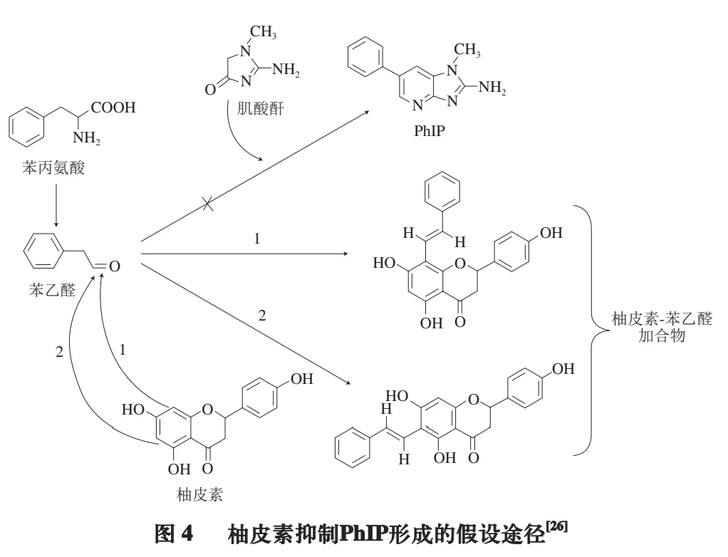 柑橘类水果中广泛存在柚皮素。Cheng Kawing等建立PhIP产生模型系统,通过加入0~0.4 mmol/L柚皮素,发现柚皮素在模型系统中有效降低了苯乙醛的含量,呈剂量依赖性。这表明,虽然柚皮素清除自由基的能力较弱,但它可以通过抑制苯丙氨酸形成苯乙醛、捕获形成后的苯乙醛,进而抑制PhIP的产生,如图4所示。此外,水果的可食用与不可食用部分均可以进行提取并加入到肉制品中,且均具有抑制HAs生成的作用,如表1所示。