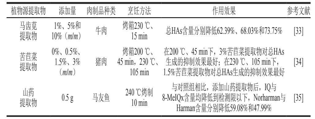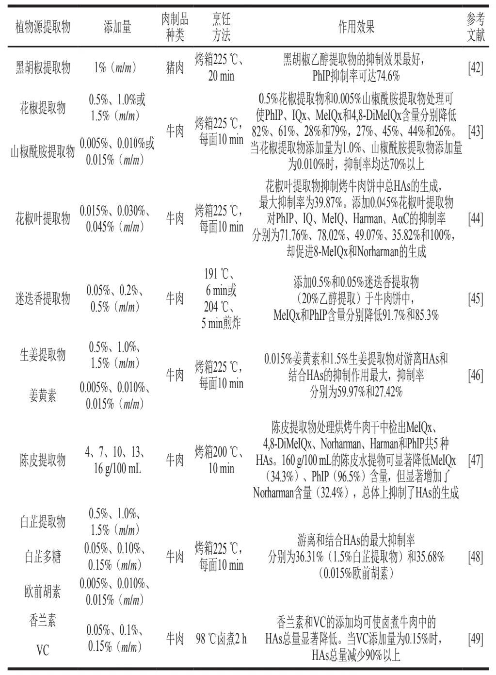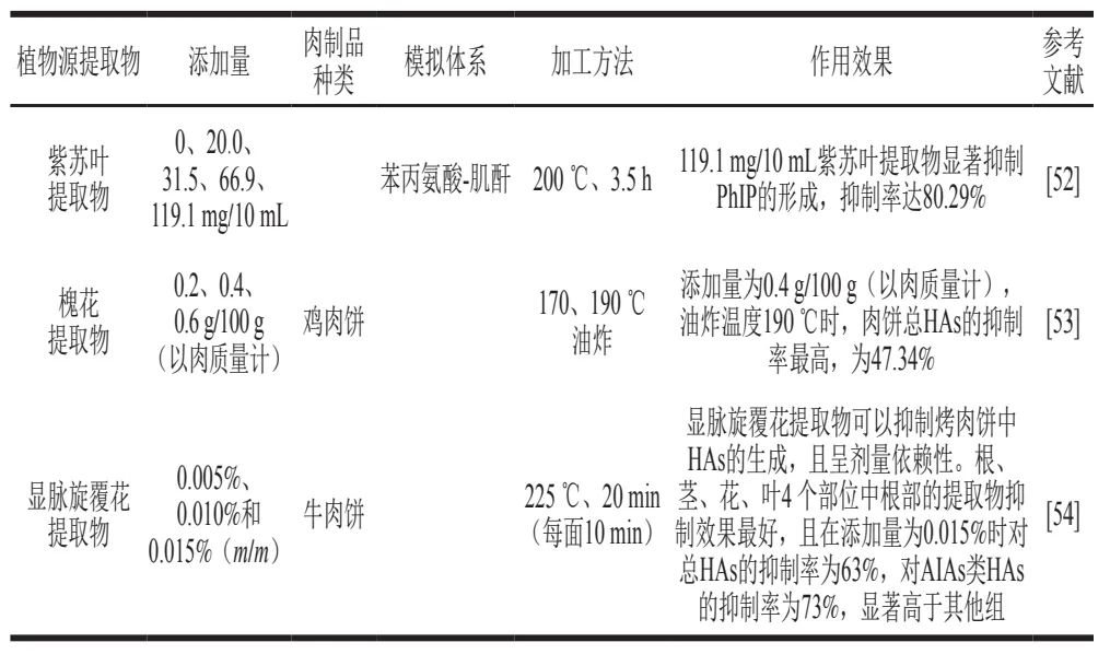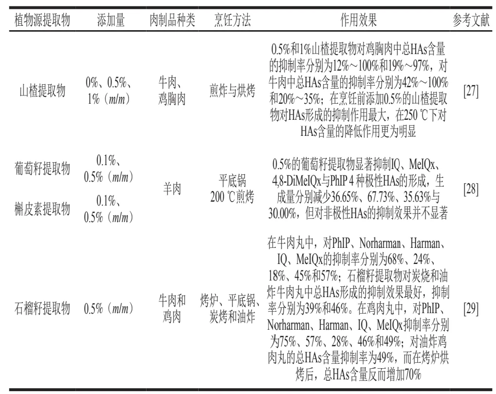 单一的植物源提取物对HAs的作用效果可能有限,或具有不佳的感官特性。因此,有学者将多种植物源提取物复配,或将植物源提取物与其他物质复配加入肉制品中,探究其作用。