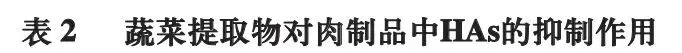 Vitaglione等建立HAs化学模型系统和肉汁模型系统,提取番茄中的α-生育酚、槲皮素和类胡萝卜素,研究类胡萝卜素和槲皮素对IQx、MeIQx和4,8-DiMeIQx的影响。番茄中的类胡萝卜素(番茄红素、β-胡萝卜素)和生育酚具有亲脂性,类黄酮(槲皮素)和抗坏血酸具有亲水性,均具有抗氧化作用。类胡萝卜素通过捕获自由基或物理猝灭单线态氧起到抗氧化剂的作用。研究表明,在化学体系中,类胡萝卜素质量浓度为1 000 mg/L时,IQx和MeIQx的抑制率分别为36%和11%。在肉汁模型体系中,1 000 mg/L的类胡萝卜素对MeIQx的抑制率为13%,对4,8-DiMeIQx的抑制率为5%。纯槲皮素质量浓度为0.1~100 mg/L时,观察到对MeIQx形成的抑制率为9%~57%。此外,部分蔬菜的提取物可以加入到肉制品中,抑制HAs的生成,如表2所示。