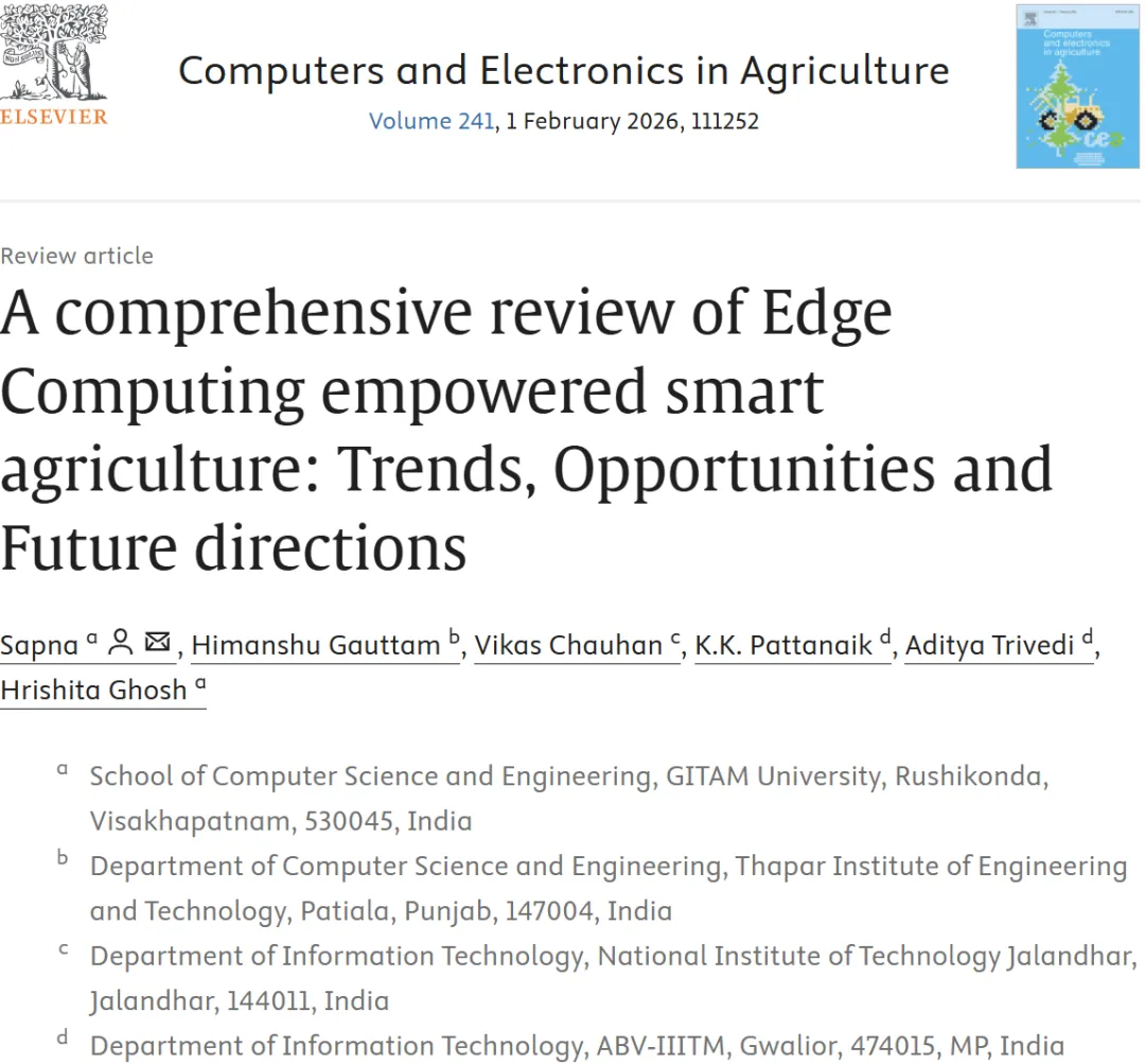 S., Gauttam, H., Chauhan, V., Pattanaik, K. K., Trivedi, A., Ghosh, H., 2026. A comprehensive review of Edge Computing empowered smart agriculture: Trends, Opportunities and Future directions. Comput. Electron. Agric. 241, 111252. https://doi.org/10.1016/j.compag.2025.111252.S.; Gauttam, H.; Chauhan, V.; Pattanaik, K. K.; Trivedi, A.; Ghosh, H. A comprehensive review of Edge Computing empowered smart agriculture: Trends, Opportunities and Future directions. Comput. Electron. Agric. 2026, 241, 111252, doi:10.1016/j.compag.2025.111252
