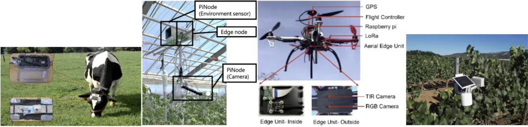 图5 为实现精准农业边缘计算而开发的各类系统原型,包括牲畜监测项圈、温室智能灌溉、无人机旱斑识别系统及智能灌溉传感器节点。