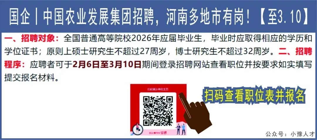 国企丨中国农业发展集团招聘,河南多地市有岗!【至3.10】