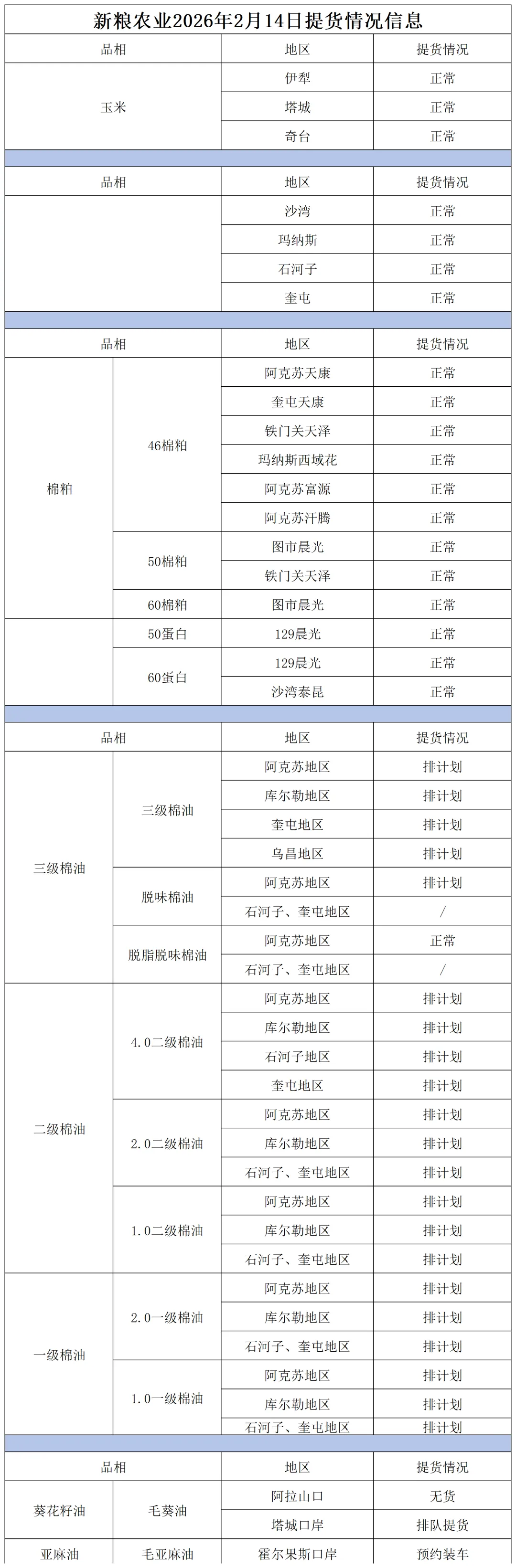 当前位置:首页>农业>新粮农业2026年2月14日提货情况