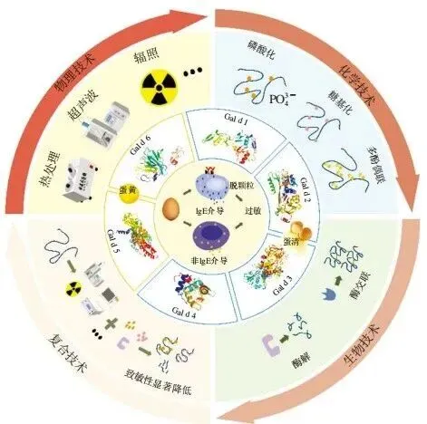 食物过敏是指机体摄入某些特定食物后由免疫机制介导的一种异常反应,在接触相同食物过敏原后可重复出现。食物过敏主要分为免疫球蛋白(Ig)E介导、非IgE介导及二者混合介导的超敏反应。大多数食物过敏反应由牛奶、鸡蛋、小麦、花生、坚果、甲壳类贝类、鱼类和大豆这8 种食物引起。其中,鸡蛋过敏发生率较高,是仅次于牛奶的第二大过敏原。采用各种有效的加工方式脱除鸡蛋过敏原甚至去除致敏性至关重要。