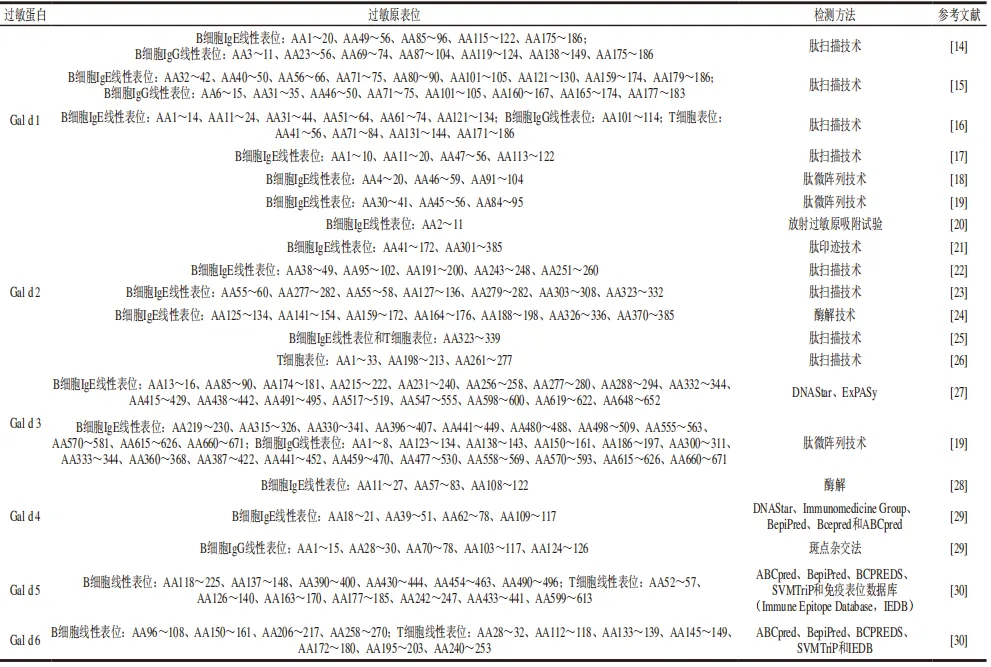 Gal d 5是一种水溶性球状糖蛋白,约占蛋黄蛋白的7%,分子质量约为69 kDa,其过敏主要是由呼吸道引发。Gal d 6是卵黄蛋白原1的前体,分子质量约为35 kDa,对热较为稳定,Gal d 6也能与鸡蛋过敏患者血清IgE发生反应。与蛋清相比,蛋黄过敏发生率较低,且由于分离和纯化蛋黄过敏原的方法效率不高,因此对这2 种过敏原表位定位研究较少。Huang Lunhui等利用生物信息学分析方法预测出Gal d 5的7 个T细胞表位和6 个B细胞表位,以及Gal d 6的4 个B细胞表位和7 个T细胞表位。