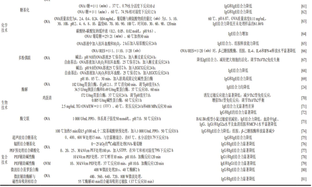 化学脱敏技术通过引入糖基、磷酸、酰胺基等基团对蛋白的部分氨基酸进行修饰,从而改变蛋白结构,掩盖或破坏线性表位和构象表位,进而影响蛋白质的致敏性。由于化学修饰直接与过敏蛋白氨基酸残基结合,可导致线性表位和构象表位无法被识别,因而能够从根本上降低鸡蛋致敏性,然而,由于在自然状态下,单一的蛋白质化学修饰程度较低,导致最终脱敏无法达到理想效果。因此,化学脱敏技术常与物理脱敏技术结合以增强脱敏效果。