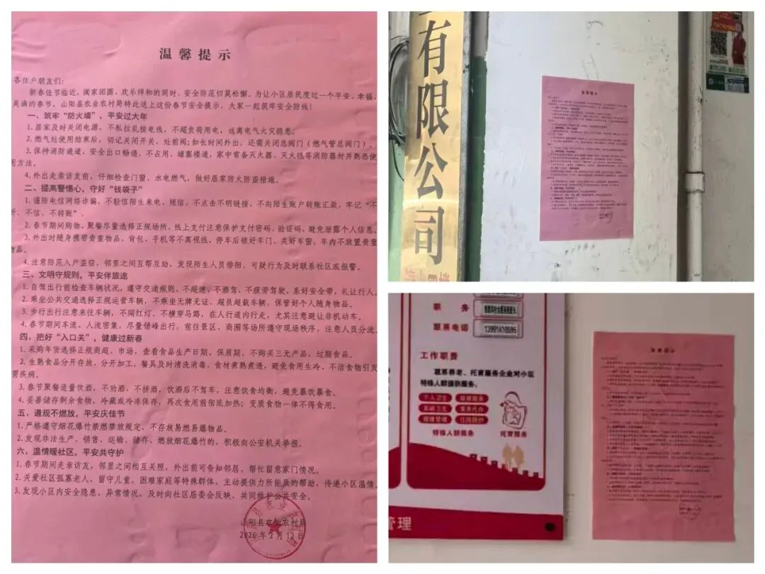 春节临近,山阳县农业农村局针对所管理的“三无”小区,开展入户安全宣传,为居民送上节日“平安符”。工作人员一大早进入小区发放张贴《温馨提示》,讲解消防安全、安排打扫环境卫生、普及用电用气知识、宣传防诈骗套路、提醒食品安全和禁燃禁放等要求,建议小区居民外出前检查水电、保持通道畅通、邻里相互照应。两天来对三个小区全覆盖,张贴提醒函38份,入户宣传提示50余人。通过面对面的方式提醒,每个楼层张贴宣传彩页,增强了居民的安全防范意识和应急自救能力,努力营造“人人讲安全、户户保平安”的浓厚氛围,确保小区群众欢度平安祥和的春节。文章来源:山阳县农业农村局
