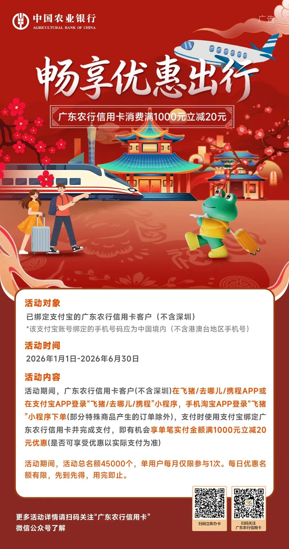【新春福利】农行信用卡畅享优惠出游,满1000元立减20元!
