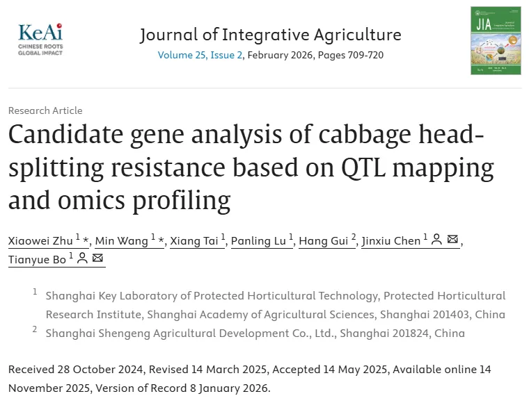 Xiaowei Zhu, Min Wang, Xiang Tai, Panling Lu, Hang Gui, Jinxiu Chen, Tianyue Bo. 2026. Candidate gene analysis of cabbage head-splitting resistance based on QTL mapping and omics profiling. Journal of Integrative Agriculture, 25(2): 709-720.