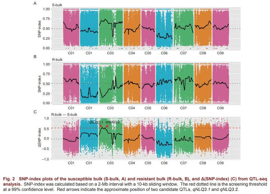 该研究通过利用两份甘蓝自交系,‘Dazhengfu’(ZF,易裂球)和‘103’(耐裂球),杂交构建的F2群体结合QTL-seq和Graded Pool-seq(GPS)分析获得1个位于C03染色体的耐裂球相关区段,命名为qNLQ3.1。随后,运用传统遗传作图分析将该位点缩小至74.6 kb的区间内。此外,通过转录组学和代谢组学对‘ZF’和‘103’进行比较分析,发现激素在调控耐裂球中起重要作用。Bol028000,编码一个拟南芥细胞分裂素响应因子(Cytokinin Response Factor 3,CRF3)的同源蛋白,被认为是与耐裂球相关的最有希望的候选基因,进一步利用Sanger测序和荧光定量PCR(Quantitative RT-PCR,qRT-PCR)对该基因进行了验证。亚细胞定位分析表明,Bol028000基因主要在细胞核中表达。另外,开发了基于Bol028000序列变异的KASP分子标记,并利用该分子标记对42份自交系进行了筛选。