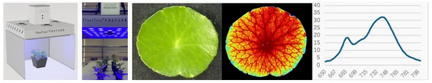 上图依次为:叶绿素荧光成像及安装在表型分析平台上的叶绿素荧光成像,及金钱草叶片彩色成像、叶绿素荧光成像与叶绿素荧光光谱