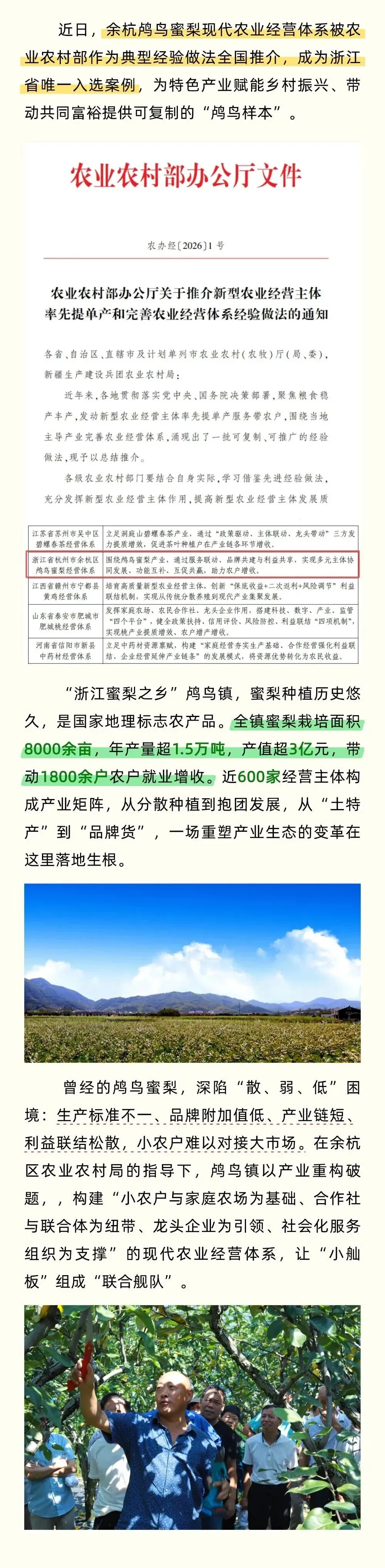 >农业农村部全国推介!余杭鸬鸟蜜梨经营体系为浙江唯一入选案例!