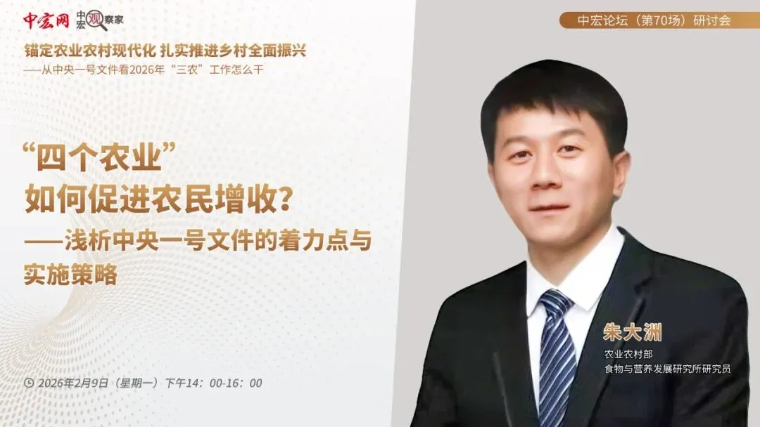 中宏网北京2月9日电 聚焦“锚定农业农村现代化 扎实推进乡村全面振兴——从中央一号文件看2026年‘三农’工作怎么干”主题,中宏论坛第七十场研讨会于9日下午圆满召开。农业农村部食物与营养发展研究所研究员朱大洲应邀出席论坛并作了主题发言。