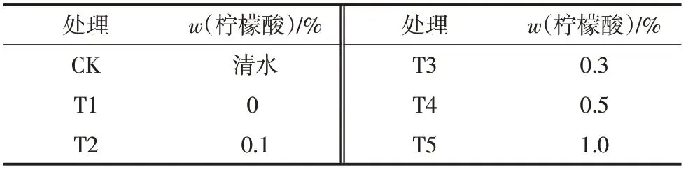 试验共设置6 个处理,其中CK 为清水对照,T1至T5为17-17-17配方中添加不同质量分数柠檬酸处理(见表1)。按T1 至T5 处理设计配制样品1 000 倍稀释液300 mL,以300 mL 清水为空白处理,用滤网将小麦种子置于盛有处理液体的杯子上方,使液体刚好浸没过种子。各个处理设置5次重复,每次重复的小麦种子为30颗。