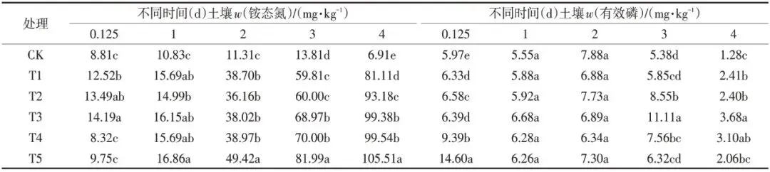 在培养3 h(0.125 d)后,CK处理土壤有效磷含量显著低于其他处理,T5 处理土壤有效磷含量显著高于其他处理。T4 处理有效磷含量显著高于T1、T2、T3 处理,T2 处理显著高于T1、T4 处理。在培养1、2 d后,各处理间有效磷含量无显著性差异。在培养3 d后,T3处理土壤有效磷含量显著高于T2 处理,T2 处理显著高于CK、T1、T4、T5 处理,且CK、T1、T4、T5处理间土壤有效磷含量无显著性差异。在培养4 d后,T3、T4处理间土壤有效磷含量无显著性差异,T3 处理显著高于CK、T1、T2、T5处理,T1、T2、T4处理间无显著性差异,且显著高于T5处理。