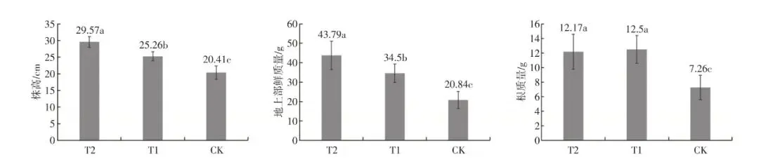 高塔复合肥添加柠檬酸对芹菜收获期生长的影响如图2所示,在芹菜收获期时,T1、T2处理芹菜株高、地上部鲜质量、根质量显著高于CK 处理,T2 处理芹菜株高、地上部鲜质量显著高于T1 处理,T1处理芹菜根质量显著高于T2处理。