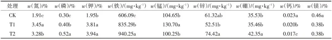 高塔复合肥添加柠檬酸对芹菜快速生长期养分含量的影响如表5所示。在芹菜快速生长气时,T2处理芹菜植株氮、磷、钾、铁、锰、锌含量显著高于CK处理,T1处理芹菜植株氮、磷、钾、铁含量显著高于CK 处理;T2 处理芹菜植株磷、铁、锰、锌元素含量显著高于T1处理。
