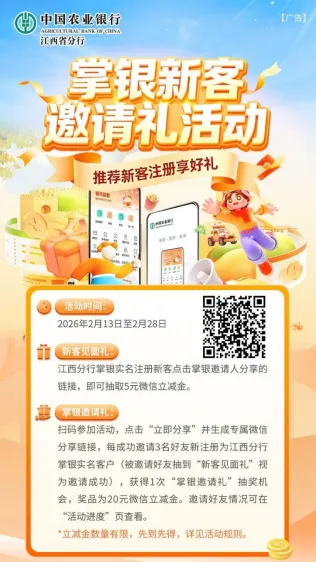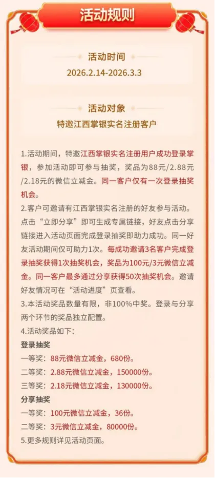 活动亮点:新客见面礼:江西分行掌银实名注册新客点击掌银邀请人分享链接即可抽取新客见面礼,得5元微信立减金。