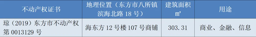 中国农业银行股份有限公司东丰县支行抵债资产位于海南省东方市八所镇滨海北路“海东方”一期小区12号楼107号商铺,所在楼层为一、二层,面积303.31平方米,建成时间为2015年,性质为商用房地产,小区配套底商,毛坯、空置,无损坏,未出租,无查封,无抵押,通水、通电;建筑结构为框架结构;外墙为涂料粉刷,建筑外观较好;层高约为3.9米,室内净高约为3.75米;防水、隔热、隔音通风、采光、日照均较好;产权清晰,东丰县支行单独所有,取得不动产登记证书。