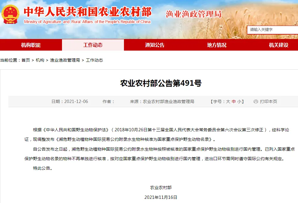 根据《中华人民共和国野生动物保护法》(2018年10月26日第十三届全国人民代表大会常务委员会第六次会议第三次修正),经科学论证,现调整发布《濒危野生动植物种国际贸易公约附录水生物种核准为国家重点保护野生动物名录》。