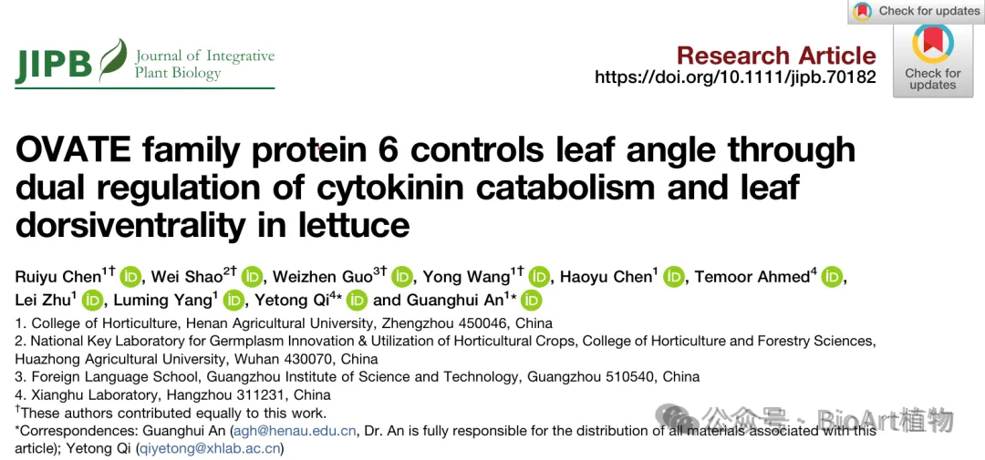 近日,河南农业大学园艺学院安光辉教授团队联合湘湖实验室戚烨通研究员团队在这一领域取得突破性进展。相关研究成果以OVATE family protein 6 controls leaf angle through dual regulation of cytokinin catabolism and leaf dorsiventrality in lettuce为题,发表于植物学权威期刊Journal of Integrative Plant Biology。该研究首次揭示了OVATE家族蛋白LsOFP6a通过调控细胞分裂素代谢与叶片背腹极性,精细控制生菜叶夹角的分子机制,为耐密植生菜品种精准设计提供了全新遗传靶点。