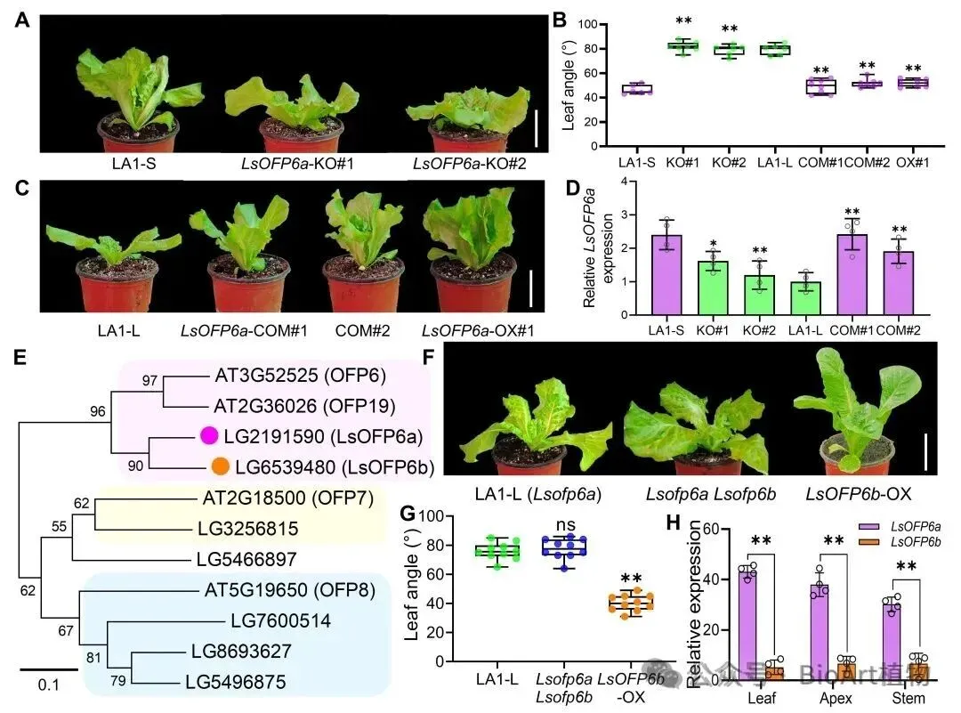 为验证其功能,研究人员通过CRISPR/Cas9技术敲除LsOFP6a基因,小叶夹角株系叶角度显著增大;而遗传互补实验则使大叶夹角植株恢复为紧凑株型。此外,研究还发现同源基因LsOFP6b功能与LsOFP6a相似,但由于其天然表达水平较低,不足以补偿LsOFP6a缺失带来的表型变化。而通过人工过表达LsOFP6b,同样可有效“矫正”大叶夹角表型,进一步确证了LsOFP6成员在负向调控叶夹角中的核心作用(图2)。